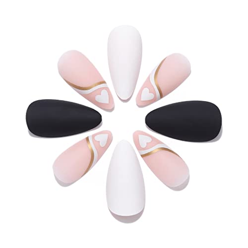 Handcess Unghie finte opache a spillo Unghie lunghe nere a pressione Unghie finte acriliche a cuore bianco da attaccare sulle unghie 24 pezzi per donne e ragazze