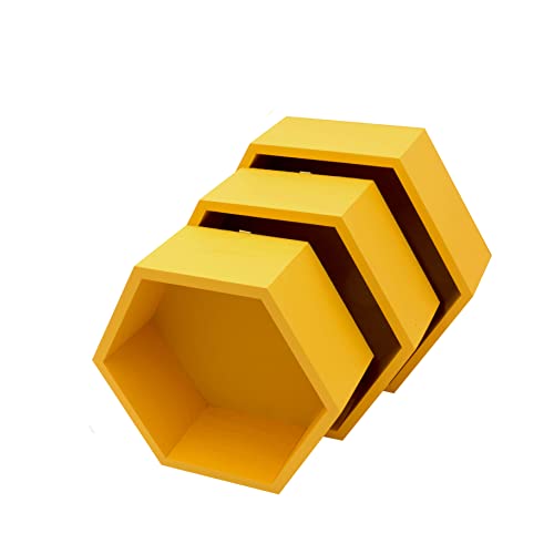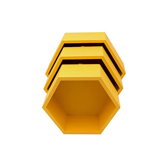 HANDKADECOR Scaffali da parete esagonali in legno giallo - ripiani esagonali a nido d'ape - Set di 3 esagoni con fondo