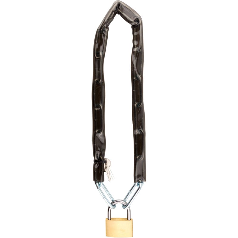 Lucchetto con catena in acciaio saldata. Include due chiavi seghettate nichelate. Esterno con rivestimento in plastica. Elevata resistenza all'ossidazione e corrosione.
