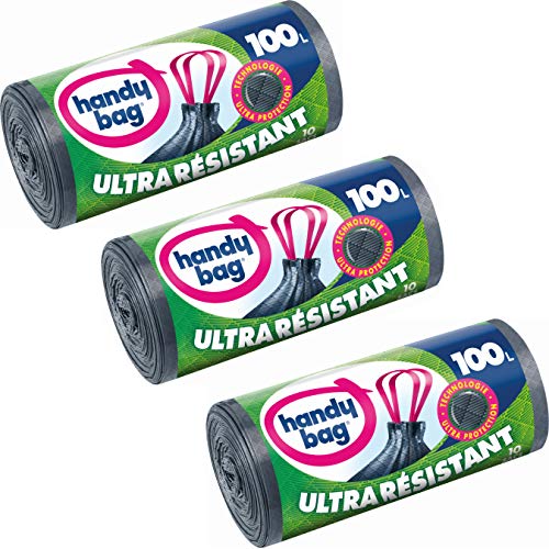 Handy Bag - 3 rotoli da 10 sacchetti per rifiuti da 100 l, manici scorrevoli, ultra resistenti, antigoccia, 82 x 90 cm, grigio scuro, opaco
