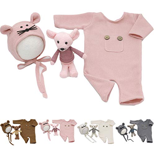 Haokaini 3Pcs Set di Oggetti di Scena per Fotografia Neonato Lavorato a Maglia per Neonato Foto Pagliaccetto Cappello Bambola di Ratto Oggetti di Scena per Foto Abiti per Neonati Ragazze