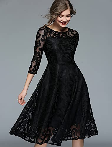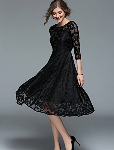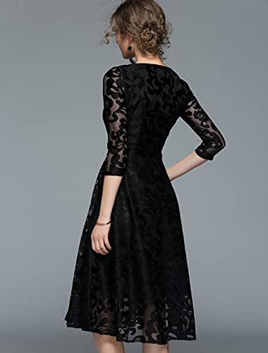 HAOKEKE Abito Longuette in Pizzo Elegante da Donna con Scollo Tondo Lungo al Ginocchio per Abbigliamento da Lavoro Nero XS