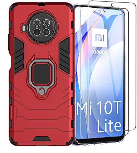 HAOREN Cover per Xiaomi Mi 10T Lite 5G + 2 Vetro Temperato, Armor Custodia con 360 Gradi Girevole Anello e Supporto Magnetico Auto, Silicone TPU e PC Doppio Strato Protettiva Bumper. Rosso