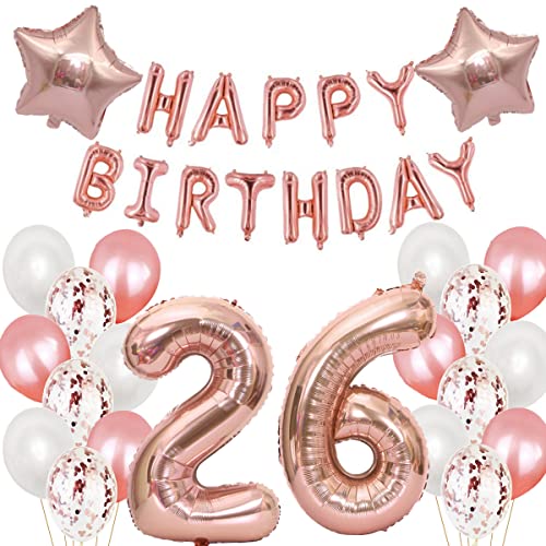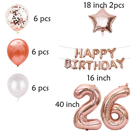 Set di decorazioni per il 26° compleanno: 16 ballerine Happy Birthday, ghirlanda goldrose, 1 rotolo di nastro decorativo, 6 palloncini in lattice bianco (12 pollici), 6 palloncini trasparenti con coriandoli in oro rosa, 12 pollici, 6 palloncini in lattice (12 pollici), 2 palloncini in lamina di stelle dorate (18 pollici). pollici. 1 palloncino digitale in pellicola color oro rosa da 40 pollici, 1 palloncino digitale da 6 pollici, colore oro rosa