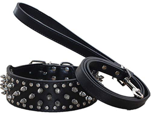 Haoyueer - Set di 2 collari per cani e guinzagli con borchie a spillo in pelle, 5,1 cm di larghezza, adatto per cani di taglia media e grande, Pitbull Husky Mastiff Terrier (XL 53,3-61 cm, nero)