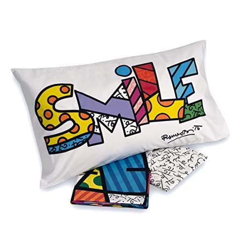 Happidea Completo Letto Lenzuola Romero Britto Disegno Smile 100% Cotone Alta Qualità Made in Italy - Lenzuolo Sopra + Federa + lenzuolo con Angoli (Singolo)