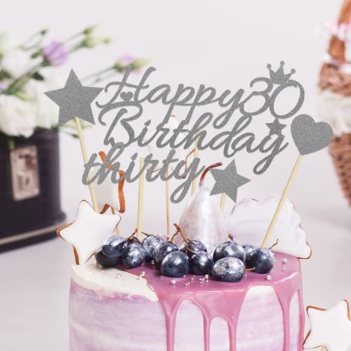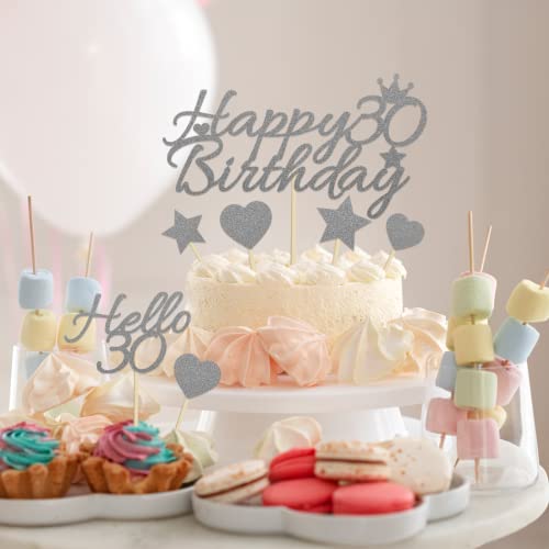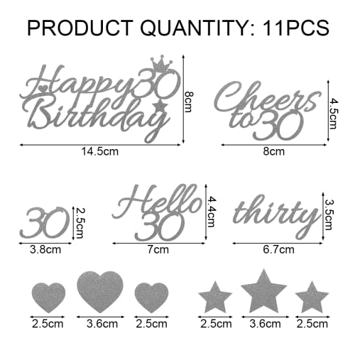 La confezione include 11 pezzi di cake topper di argento compleanno in 7 stili, tra cui 1 pezzo grande Happy 30th Birthday, 1 pezzo Cheers to 30, 1 pezzo Thirty, 1 pezzo Hello 30, 1 pezzo number 30, 3 pezzi star e 3 pezzi cake topper a forma di cuore.