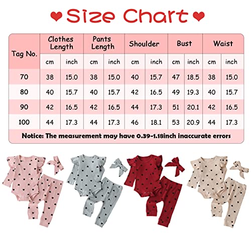 Happy Cherry Neonata Completini Cotone 3 Pezzi Pagliaccetto Balza Top a Manica Lunga + Pantaloni Cuore Stampa + Fascia Bimba Completi Lavorato a Maglia per Infante 18-24 Mesi