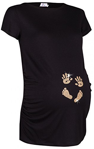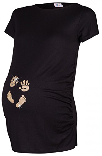 Happy Mama. Donna Maglietta Premaman Top T-Shirt Mani e Orma del Bambino. 013p (Nero & Oro, IT 42/44, M)