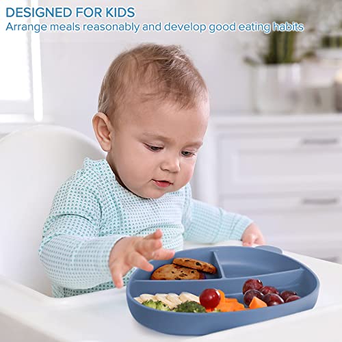 Happy T - Piatto in silicone antiscivolo per bambini, 3 scomparti, con coperchio a ventosa, senza BPA, adatto per microonde, lavastoviglie, seggiolone, colore: Blu