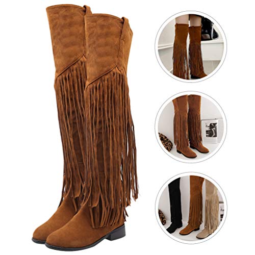 Happyyami Donna Stivali Alti sopra Il Ginocchio Single Sole Stiletto Boot with Tassel Pull on Slouch Boots Chunky Block Heels Boots for Women Girls Autumn Winter Light Brown