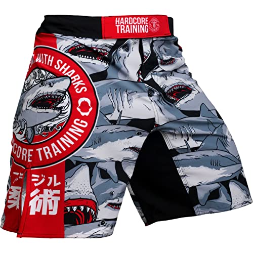 Hardcore Training Sharks Fight Shorts Uomo Pantaloncini da Combattimento Arti Marziali MMA BJJ Boxe Muay Thai Grappling Fitness No Gi