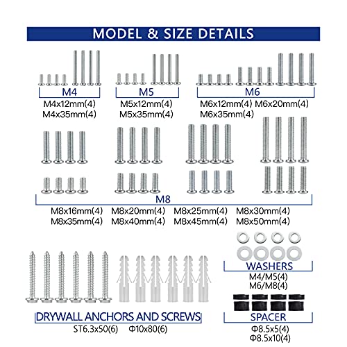 Kit hardware universale: include viti TV M4, M5, M6, M8, rondelle e distanziatori. Inoltre, sono inclusi viti e tasselli per cartongesso. Adatto a tutti i televisori fino a 80 pollici, funziona con qualsiasi supporto TV, supporto per monitor e supporto TV.