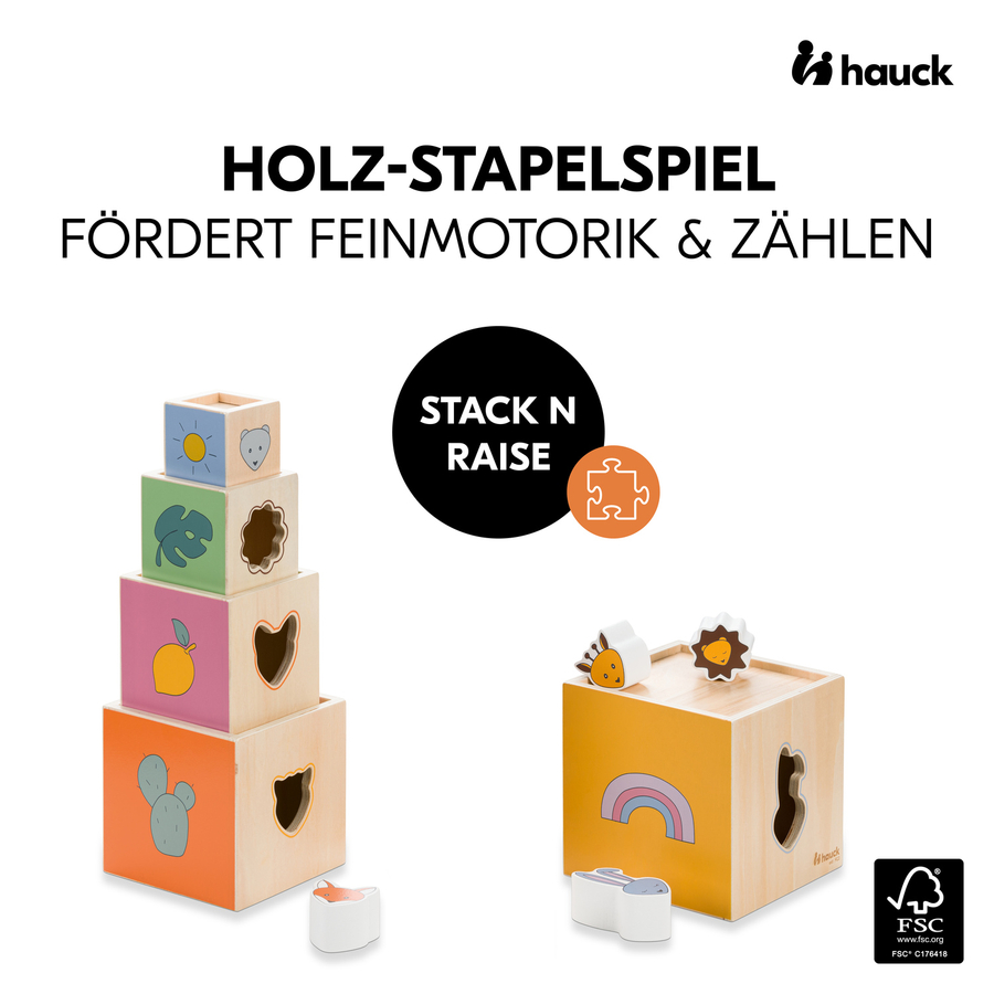 Dettagli del prodotto: Età consigliata: dai 12 mesi in su Promuove le abilità motorie Allena la coordinazione occhio-mano, la motricità fine e la conoscenza dei diversi colori e forme Favorisce il pensiero logico mentre si impilano i cubi di dimensioni corrispondenti Gioco divertente e occupazione significativa Dimensioni e peso: Misure: 13,7 x 13,5 x 13,6 cm Materiale e cura: Materiale: legno proveniente da foreste certificate FSC®. Istruzioni per la cura: pulire con un panno umido Incluso nella consegna: Hauck Torre di impilamento in legno con forme - Stack N Raise