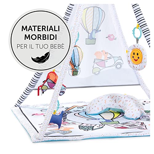 DALLA NASCITA: il morbido tappeto neonato offre sin da subito un alto comfort. Rimuovendo l'arco, la palestrina evolutiva può essere utilizzata anche come coperta per gattonare o come spazio creativo