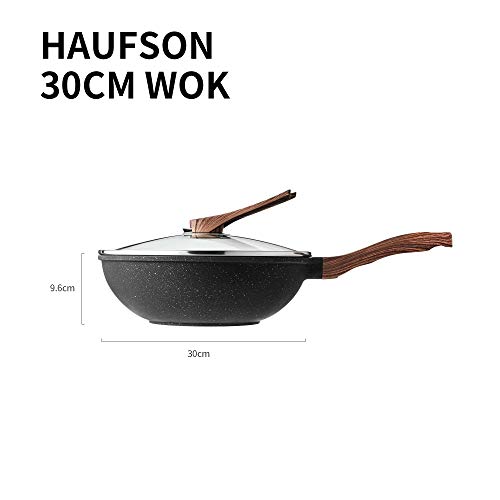 Haufson - Wok pressofuso con coperchio regolabile, 30 cm, funziona con tutti i piani cottura, antiaderente naturale senza PFOA, utensili da cucina professionali per la tua casa (manico marrone), 30 cm