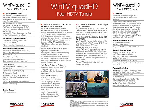 Standard TV supportati: TV HD ATSC, stereo/doppio canale audio. Quattro sintonizzatori su una scheda PCI Express dall'altezza dimezzata. Wintv-quadHD si adatta a PC con staffa piena e media. Guarda, metti in pausa o registra fino a quattro programmi TV HD ATSC o QAM in chiaro nello stesso momento. Include un telecomando Hauppauge, con cavo ricevitore IR da 1 metro. Include l'applicazione WinTV v8, che ti permette di vedere la TV in finestra o a pieno schermo, con la funzione picture-in-picture. Funziona anche con Windows Media Center (incluso in Windows 7 e opzionale in Windows 8). Wintv-quadHD dispone di 4 sintonizzatori per poter guardare un programma TV o registrare fino a 4 programmi TV allo stesso tempo. ATSC è la TV HD in chiaro per gli Stati Uniti e il Canada. Clear QAM è la TV digitale via cavo.