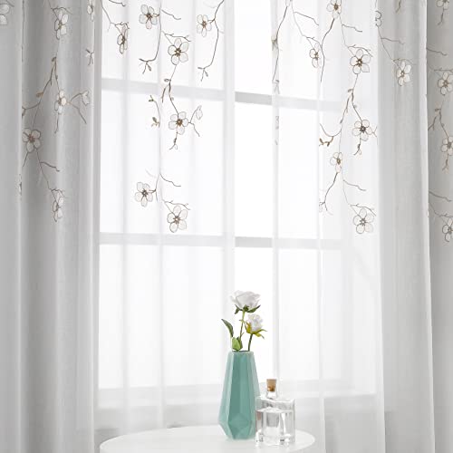 HAUSPROFI 2 tende trasparenti con motivo floreale ricamato, stile rustico, soggiorno, tenda decorativa per finestra con occhielli, set da 2 pezzi, fiori marroni, larghezza x altezza: 130 x 210 cm