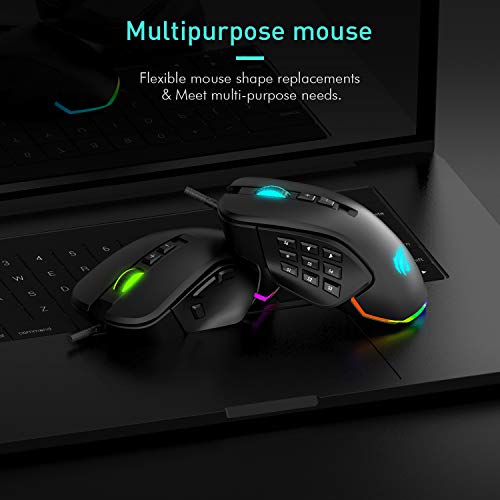 Havit Mouse Gaming RGB Wired【12000 DPI & 14 Pulsanti Programmabili 】, Pannelli Laterali Sostituibili (8 Buttons/8 + 6 Tasti Laterali Mouse), Sostituibile Right Panel Design Ergonomico, Nero (MS760)