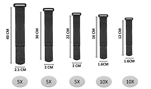 Dimensioni comuni: ogni confezione da 35 fascette stringicavo con occhiello (fibbia) contiene: 12 cm x 10 pezzi, 16 cm x 10 pezzi, 22 cm x 5 pezzi, 30 cm x 5 pezzi e 40 cm x 5 pezzi. Larghezza: 1,6 - 2,5 cm
