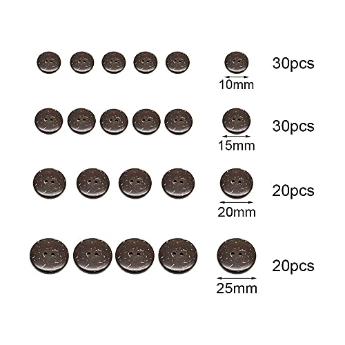 La confezione include: Un totale di 100 bottoni in cocco, inclusi 30 pezzi da 10 mm, 30 pezzi da 15 mm, 20 pezzi da 20 mm e 20 pezzi da 25 mm.
