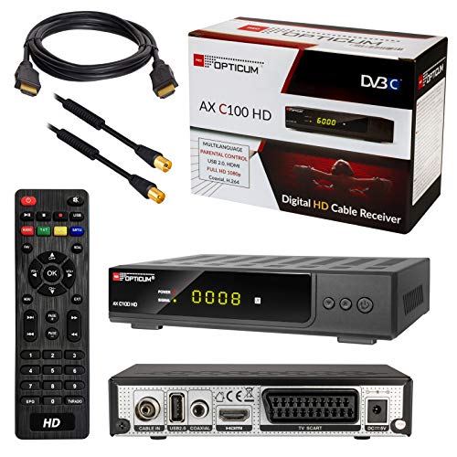 HB-DIGITAL Set: Opticum AX C100 HD ricevitore per TV digitale via cavo (HDMI, SCART, USB 2.0, lettore multimediale) + cavo antenna HDTV da 1 m placcato oro con filtro a guaina nero + cavo HDMI