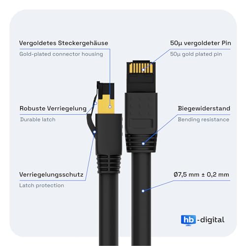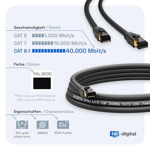 HB-DIGITAL Cavo di rete CAT 8.1 S/FTP LSZH nero 40 Gbits | Cavo patch LAN Gigabit RJ45 maschio Ethernet | 40000 Mbits velocità di trasferimento PIMF 2000 MHz Cat.6 Cat.7 Cat.8