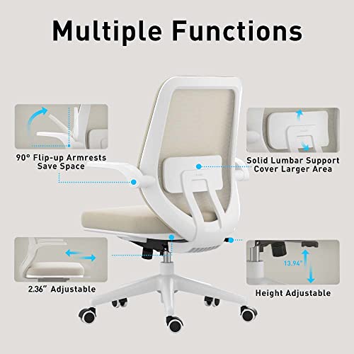 Hbada Sedia da Ufficio Ergonomica, Sedia da Lavoro con Braccioli Pieghevoli e Supporto Lombare Allargato, Sedia Girevole, Sedia da Computer in Rete, Sedia Piccola, Bianco