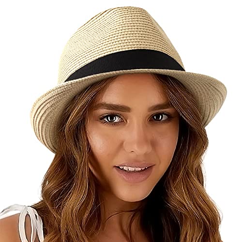 Hcimooy Cappello di Paglia a Tesa Corta da Donna Cappello Panama Fedora Beach Sun Trilby per Le Vacanze Cappello Estivo Arrotolabile da Uomo (Beige)