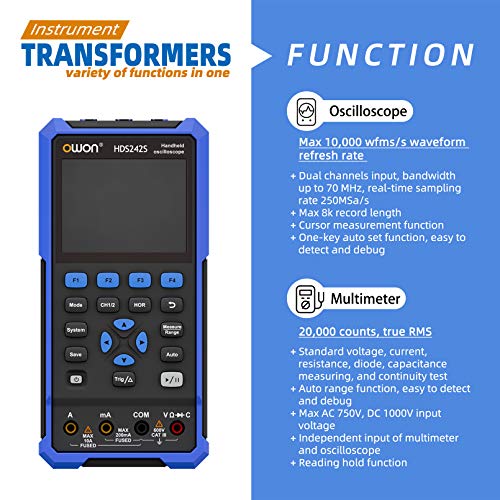 OWON HDS242s Oscilloscopio palmare, Multimetro digitale da 20000 conteggi, digitale 2 canali 3 in 1 Tester universale, generatore a 1 canale 40Mhz larghezza di banda USB con display LCD 3,5 pollici