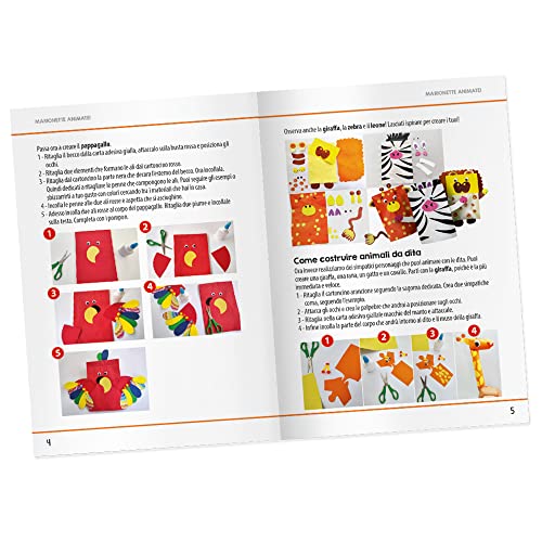 OTTIMI CONTENUTI per giocare in più modi e divertirsi imparando: 5 buste di carta, cartoncino colorato, occhietti adesivi, colla vinilica, pompon, carta adesiva, 4 pennarelli colorati, forbici, istruzioni.