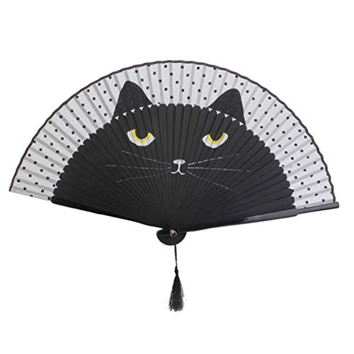 Healifty Ventaglio pieghevole a forma di gatto in seta, per ragazze e signore, 1 pezzo (nero)