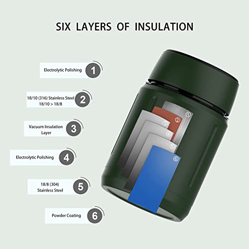 Mantiene caldo fino a 12 ore: design sottovuoto a doppia parete al massimo livello. Con un sacchetto isolante aggiuntivo per un maggiore isolamento, può mantenere caldo fino a 12 ore o mantenere freddo fino a 24 ore. Per la massima efficienza termica, si consiglia di versare acqua calda e fredda per preriscaldare e pre-raffreddare per 5-10 minuti prima di confezionare il cibo.