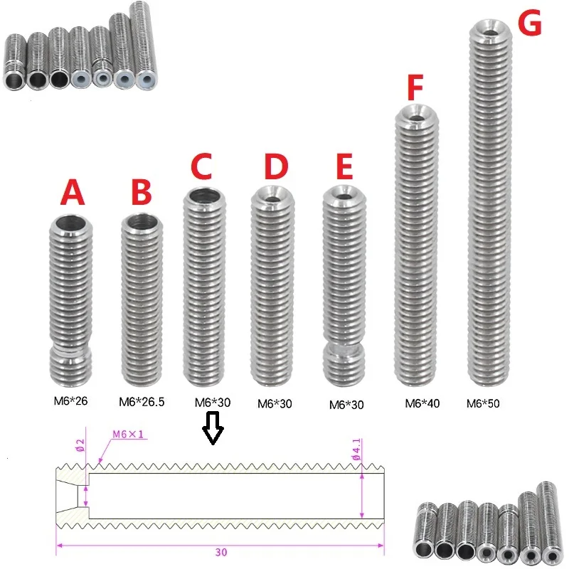 Mega 2pcs mk8 heatbreak 26 26.5 30 40 50mm heat break with slot ptfe tube m6 thread throat 3d printer part for 1.75mm filament