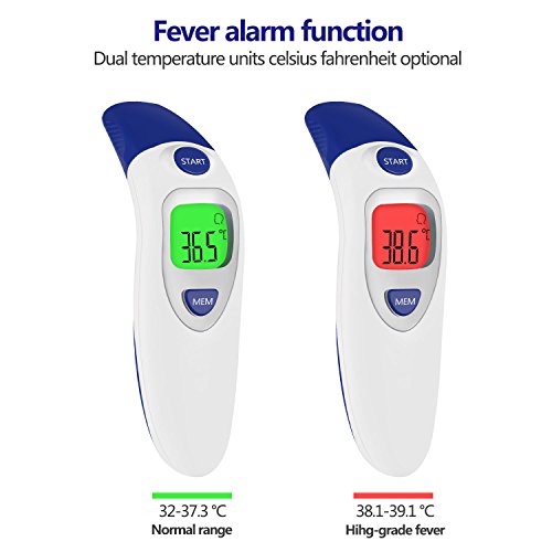 【Allarme febbre e funzione memoria warning Avviso febbre acustica e visiva, quando la temperatura è superiore alla gamma normale (38 ° C). Memorizzazione di un massimo di 20 misurazioni, ciascuna misura corretta viene memorizzata insieme alla modalità di misurazione. Pertanto, è possibile controllare la cronologia della temperatura delle ultime misurazioni effettuate in qualsiasi momento.