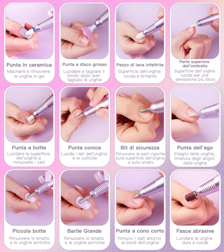 【Multifunzione levigatrice per unghie】 La levigatrice professionale per unghie 35000 giri comprende 12 tipi di punte professionali per unghie e 26 strisce abrasive, ideali per tagliare, macinare, scolpire, tagliare, lucidare tutte le arti delle unghie e per rimuovere le cuticole, apprezzate dai tecnici professionali delle unghie e dagli amanti dell'arte delle unghie.