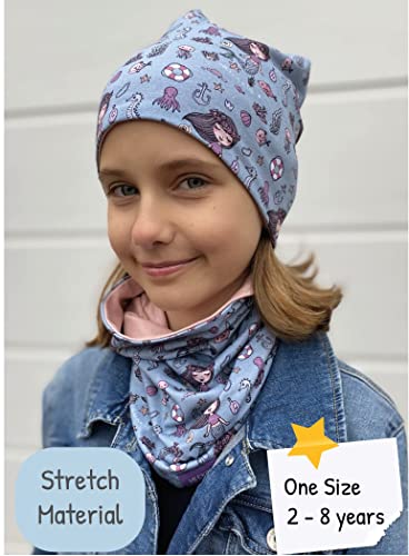 HECKBO Berretto Modello Beanie + Girocollo per Bambini - Cuffia Reversibile con Sirena - da 2 anni - 95% Cotone - Morbido e Pratico Tessuto Elasticizzato - Primavera Estate Autunno