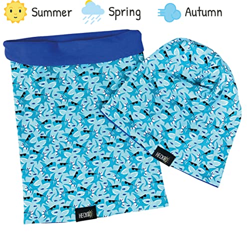 FANTASTICO SET CON CAPPELLO E GIROCOLLO: Riceverai 1 berretto HECKBO modello beanie e 1 girocollo HECKBO, entrambi decorati con un simpatico motivo a squali: un must per tutti gli appassionati di queste affascinanti creature marine Il cappello e il girocollo sono realizzati in morbido tessuto elasticizzato e sono adatti a bambini tra i 2 e i 8 anni.