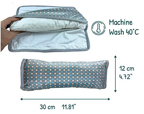 ► CONTENUTO DELLA SPEDIZIONE: 1 cuscino per cintura di sicurezza con motivo a stelle e federa rimovibile. Colore: grigio chiaro, beige, turchese;