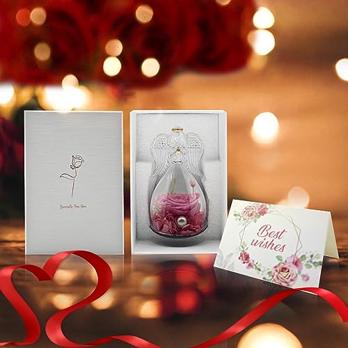 Heekim Regali Compleanno Donna, Angeli Statuette con Rosa Eterna, Floreale Fatta a Mano, Regalo Mamma Nonna Moglie Fidanzata Anniversario Compleanno Valentine Regali per Lei (Rosa)