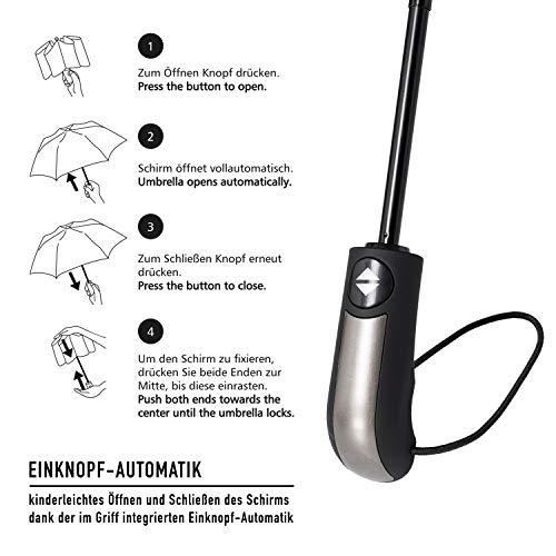 AUTOMATICO APRI CHIUDI - Che si tratti di pioggia, vento o tempesta, con la semplice pressione di un pulsante l'ombrello si apre (portata di 95 cm) in qualsiasi momento in modo rapido, semplice e affidabile.