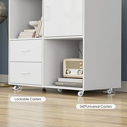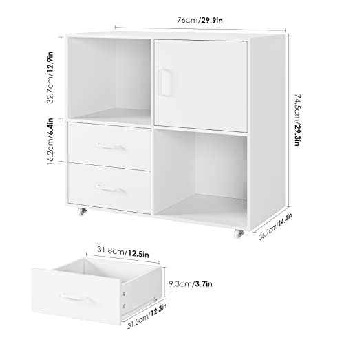 Hefoths Mobile Porta Stampante, Armadi di Supporto per L'ufficio, Armadietto Portadocumenti con 1 Anta, 2 Cassetti e 2 Vani Portaoggetti, Adatto a Soggiorno, Studio, Ufficio, Bianco