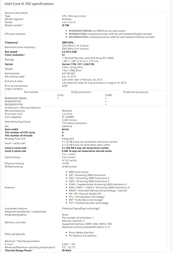 Hegem Processore CPU Intel Core I5-760 I5 760 2,8 GHz Quad-Core Quad-Thread 8M 95W LGA 1156 Senza Ventola