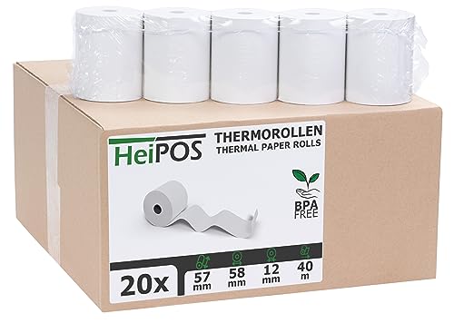 HeiGroup - HeiPOS 20x rotoli termici BPA free (W/Ø) 57mm / 58mm - lunghezza 40m, anima Ø 12mm, peso 52 g/m2, spessore 60 µm, durata di conservazione 10 anni