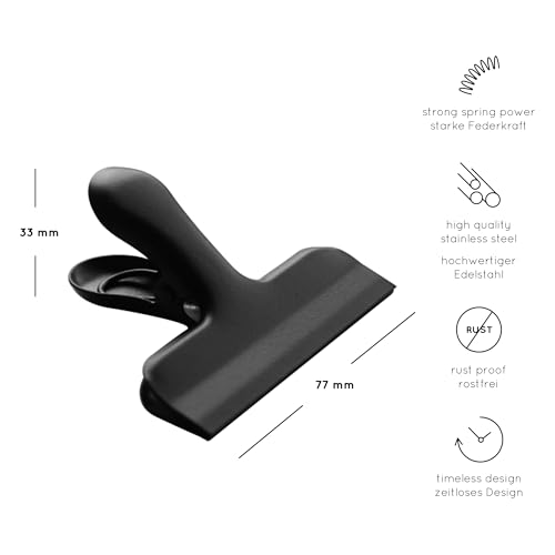 Heimzeit Design Clips Chiudi Sacchetti, buste per Alimenti e Documenti in Acciaio Inossidabile di alta Qualità, Nero [8 Pezzi, 77 x 20 x 30 mm] Morsetti Colorati, Forte Forza elastica