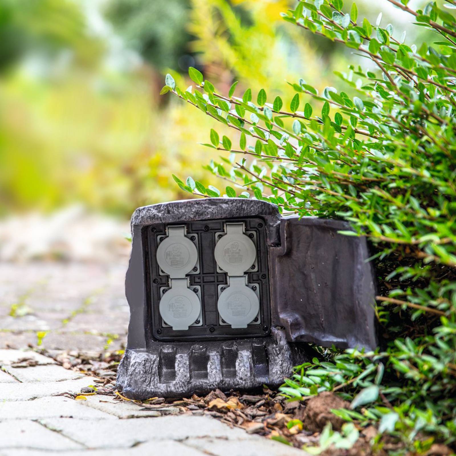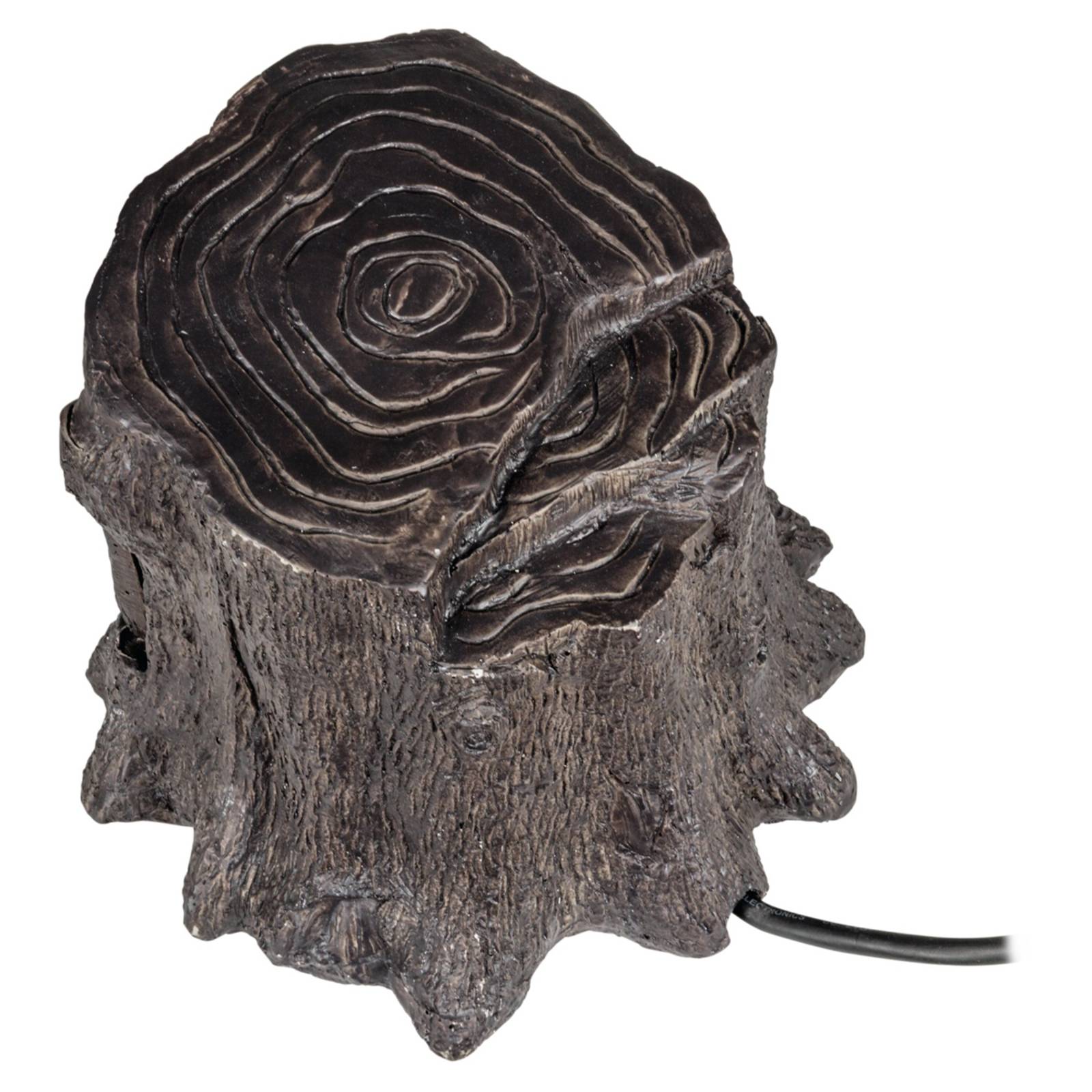 Allacciamento elettrico Tronco a quattro uscite con telecomando L'allacciamento elettrico sembra veramente un tronco d'albero, ma sotto al coperchio a molla si trovano quattro prese elettriche. Permette di sistemare le spine delle lampade o di attrezzi in modo invisibile e le protegge dalle intemperie. L'allacciamento elettrico supporta un carica massimo di 1.200 W. Ogni singola presa può essere accesa e spenta singolarmente tramite il telecomando compreso nella fornitura. Il raggio di azione del telecomando è di circa 30 metri. Comprende anche un cavo di allacciamento da 5 m H0zRN-F3G1,5.