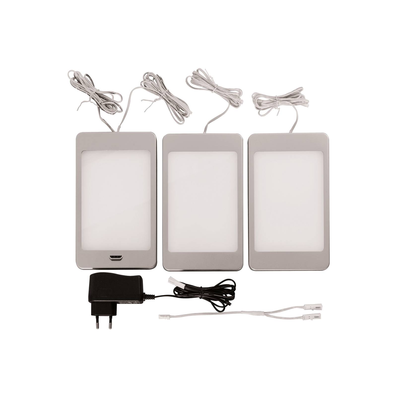 Set di luci sottopensile a LED Saskia con interruttore a sensore integrato Un interruttore a sensore si trova su uno dei tre apparecchi LED sotto il mobile. Con esso, è possibile un oscuramento senza contatto e senza gradini, così come l'accensione e lo spegnimento della luce. Questo rende l'apparecchio a LED Saskia un compagno moderno e pratico per la cucina e il soggiorno. La superficie opaca di emissione della luce impedisce l'abbagliamento e fornisce una luce bianca calda e piacevole. Grazie alle dimensioni compatte, i pannelli possono essere facilmente integrati in una grande varietà di stanze e allo stesso tempo appaiono poco appariscenti ed eleganti. Gli apparecchi sottopensile sono forniti completamente pronti per il collegamento, un trasformatore è incluso.