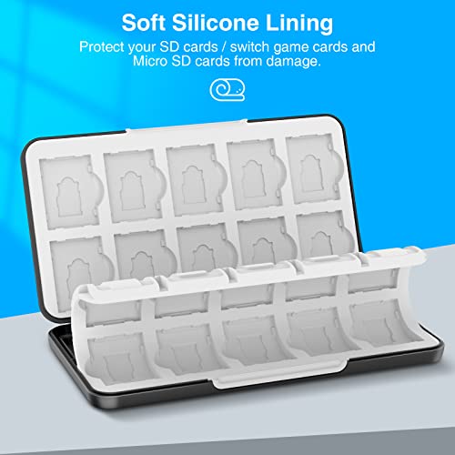 Suggerimenti: Le schede di gioco e le schede di memoria presenti nelle immagini non sono incluse. La custodia è progettata per organizzare le schede di gioco o le schede SD e Micro SD di Switch.