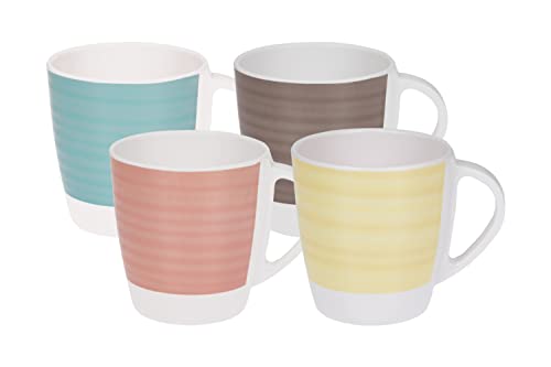 Set da 16 pezzi composto da stoviglie da campeggio per 4 persone, colore bianco avorio/colorato, rotonde: 4 piatti piani Ø 25,5 cm x 25,5 cm - 4 piatti da dessert Ø 20,5 cm x 20,5 cm - 4 ciotole da zuppa Ø 15 cm x 7 cm - 4 tazze con manico 0,3 L Ø 8,5 cm