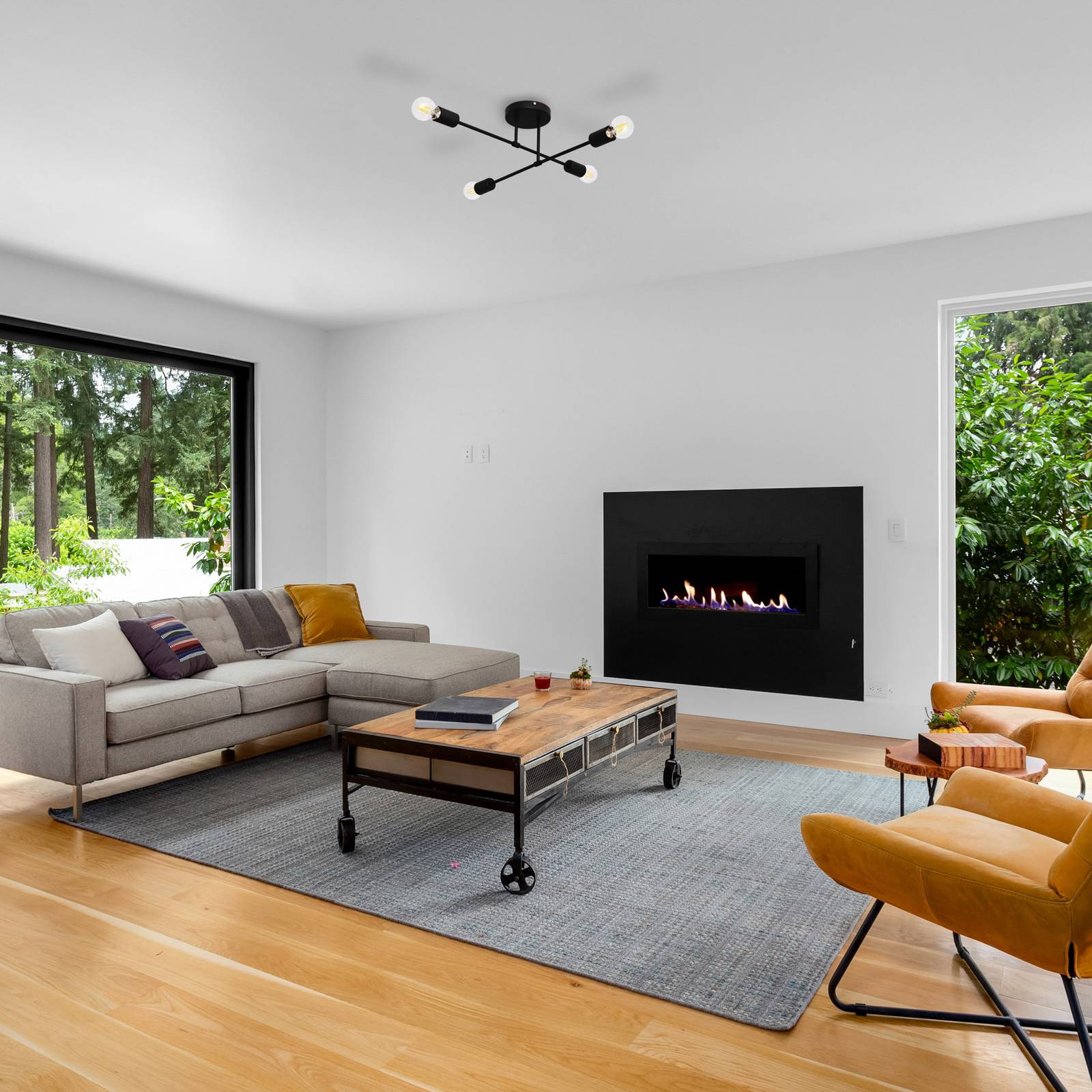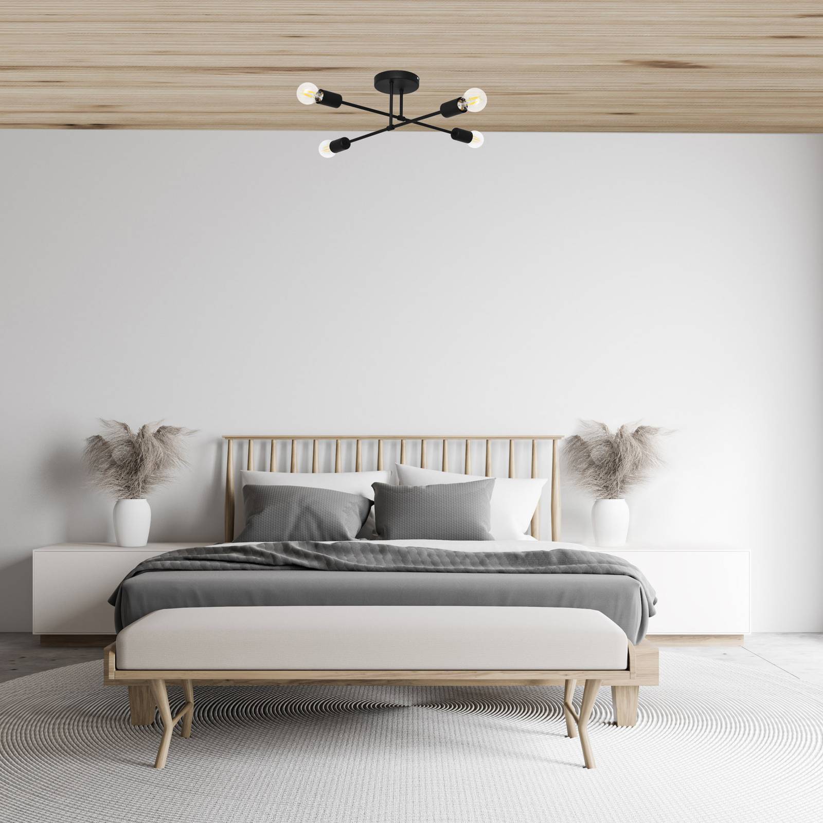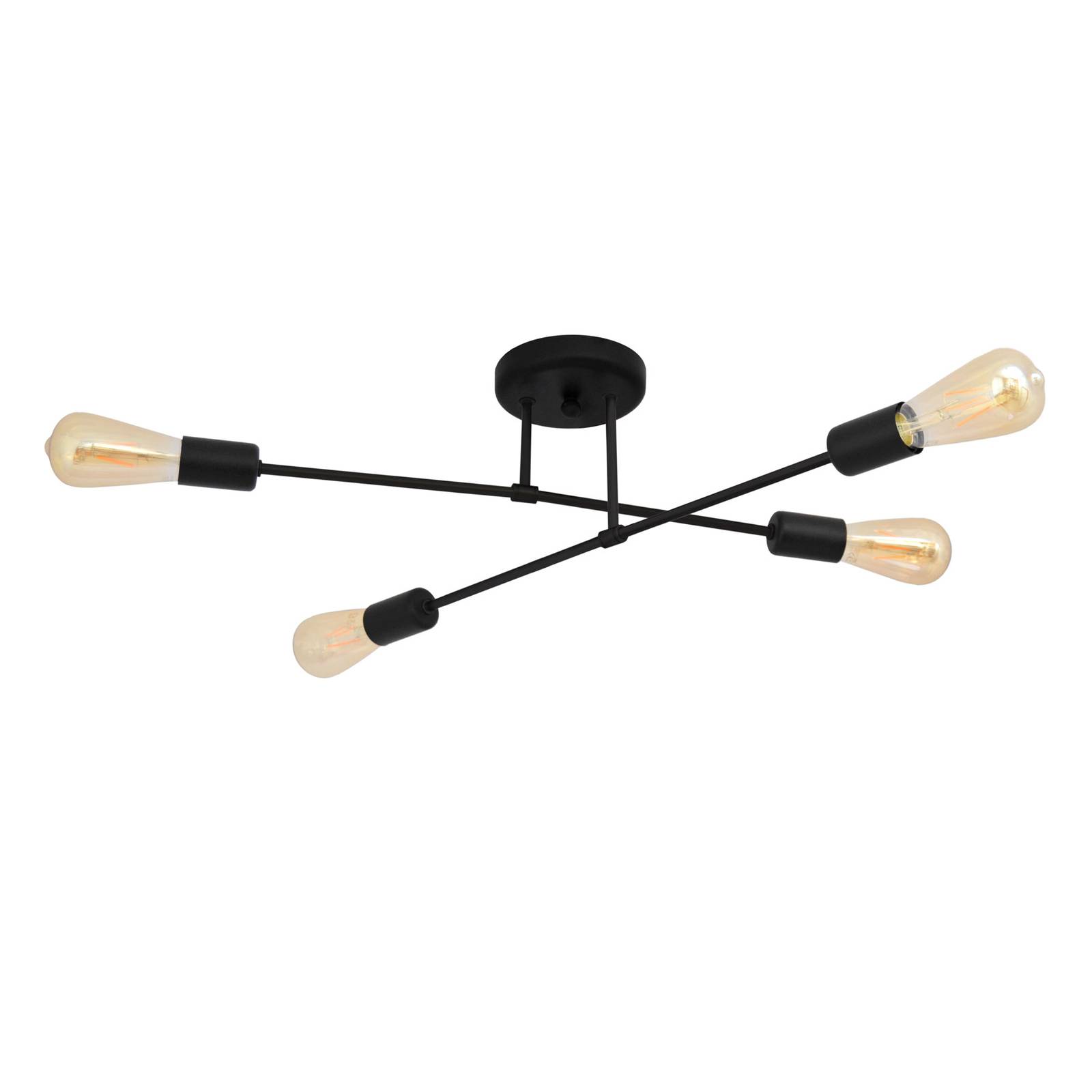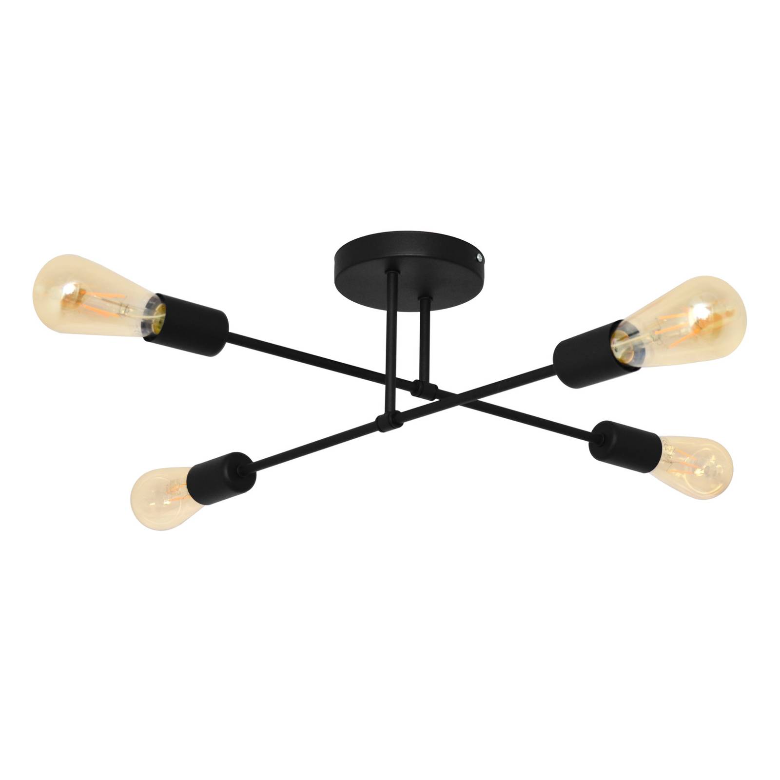 Lampada da soffitto a quattro fiamme Cambridge Cambridge è una lampada da soffitto a quattro fiamme che si distingue per il suo design minimalista ma di grande effetto. È costituito da una piastra rotonda per il soffitto e da due puntoni ad essa collegati, dotati di una presa cilindrica a ciascuna estremità. Sia la piastra del soffitto che i montanti, compresi i portalampada, sono rivestiti con una finitura nera, in modo che Cambridge si integri armoniosamente in numerosi concetti di colore e ambiente. La deliberata omissione dei paralumi consente alla luce di fuoriuscire in tutte le direzioni, ottenendo un'illuminazione uniforme della stanza. Ideale per l'utilizzo di lampadine decorative vintage (vedi accessori).